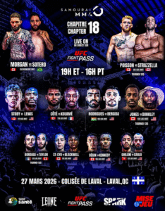 2026 symbolise aussi une période de transition pour le MMA québécois dans son ensemble. Plusieurs des meilleurs espoirs de la province prennent désormais leur envol à l’extérieur de la sphère Samourai : certains multiplieront les apparitions chez Unified dans l’Ouest canadien, tandis que d’autres, comme Tommy Morrison et Jonathan Ramsey, ont choisi d’exporter leur talent vers les États-Unis, avec l’objectif ultime de décrocher un contrat avec l’une des grandes organisations internationales du sport. Cette nouvelle réalité a ainsi forcé Daniel Lafond et son équipe à faire preuve de créativité et d’audace dans le matchmaking de l’événement de vendredi.