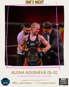 Agisheva built her foundation almost entirely within the Russian amateur MMA system, competing extensively under the national federation, notably in IMMAF competitions. Between 2021 and 2023, she logged bouts at Russian championships and international tournaments, including the IMMAF World Championships, where she won gold at the junior level in 2022. She also captured medals at European competitions, results that placed her among the more visible prospects of her cohort before turning professional, although her amateur record isn’t impressive in itself at 4-4.