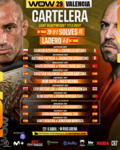 WOW 29 takes place on April 11 at the Roig Arena in Valencia. The 11-fight card showcases rising European talent. In the main event, Enoc Solves Torres defends his light-heavyweight title against Daniel Ladero. The lineup blends experienced regional fighters with promising prospects. Here’s who to watch this weekend.